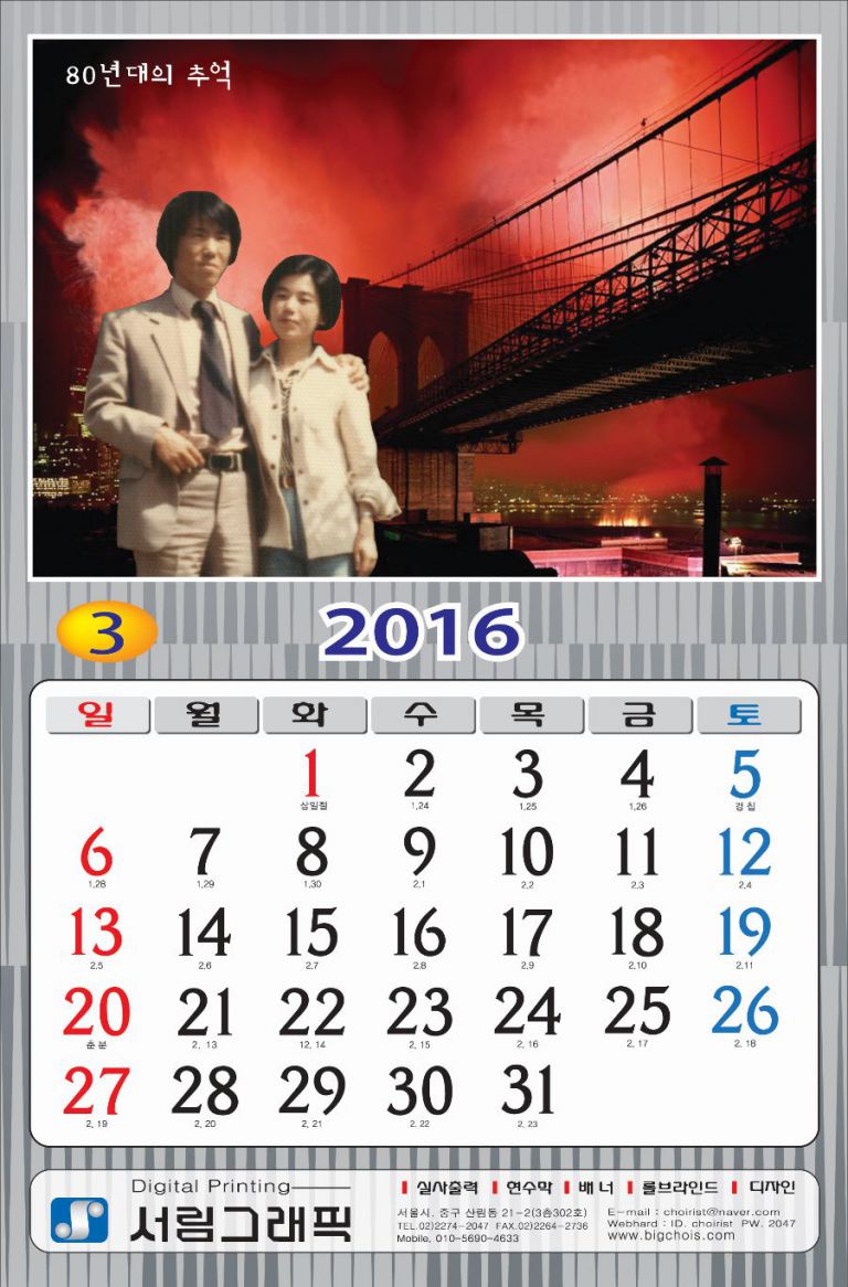 Seorim Graphics최신장비와 우수한 기술력!!!서림그래픽은 각종현수막, 각종 배너게시대, POP, 롤브라인드, 현황판, 광고실사출력을 전문으로 하고 있습니다. 언제나 고객의 기호와 그 목적달성에 최대한 충족 시키기 위해 최선을 다하겠습니다.자세히 보기 웹하드 안내 ID : choirist PW : 2455kts#E-mail : choirist@naver.com 입금계좌 안내 198-810232-97607은행명 : 하나은행 예금주 : 최용철 PORTFOLIO서림 포트폴리오 사진합성 여행지 사진 부모님 생신축하기념 족자 나만의 카렌더 CS CENTER문의사항이 있으시면 연락주세요. 02-2274-2047fax. 02-2264-2736상담문의 바로가기 일요일휴무 / 평일: 09:00~20:00 / 토요일: 09:00~15:00